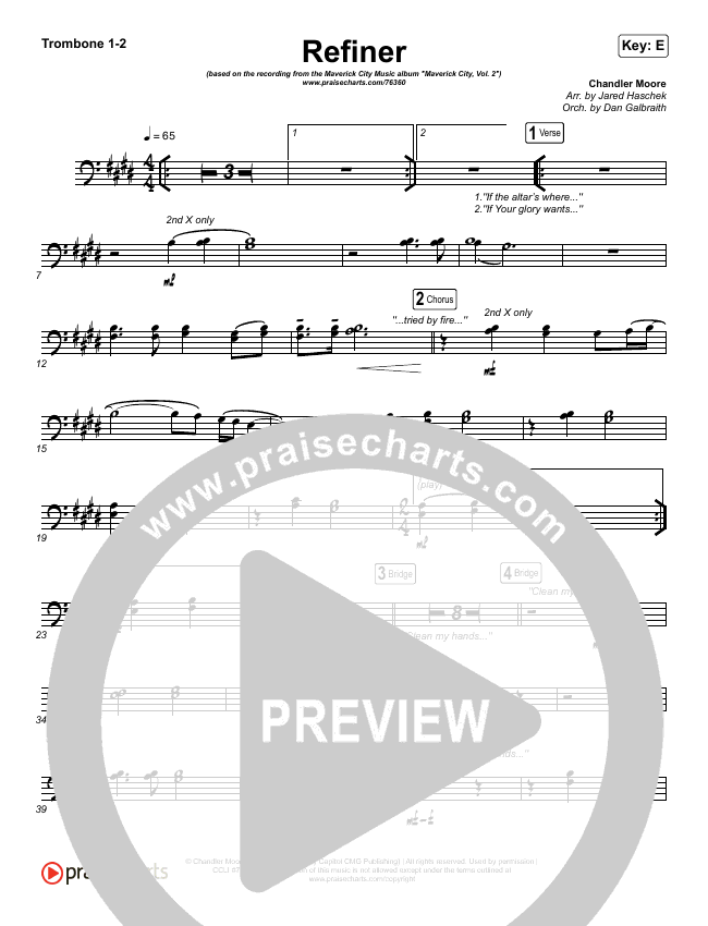 Download the Orchestration brass parts for Refiner by Maverick City Music / Steffany Gretzinger, from the album Maverick City Vol. 2. This song was arranged by Jared Haschek / Daniel Galbraith in the key of E, F.