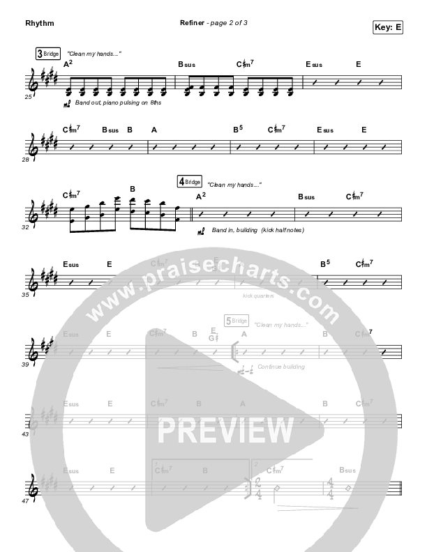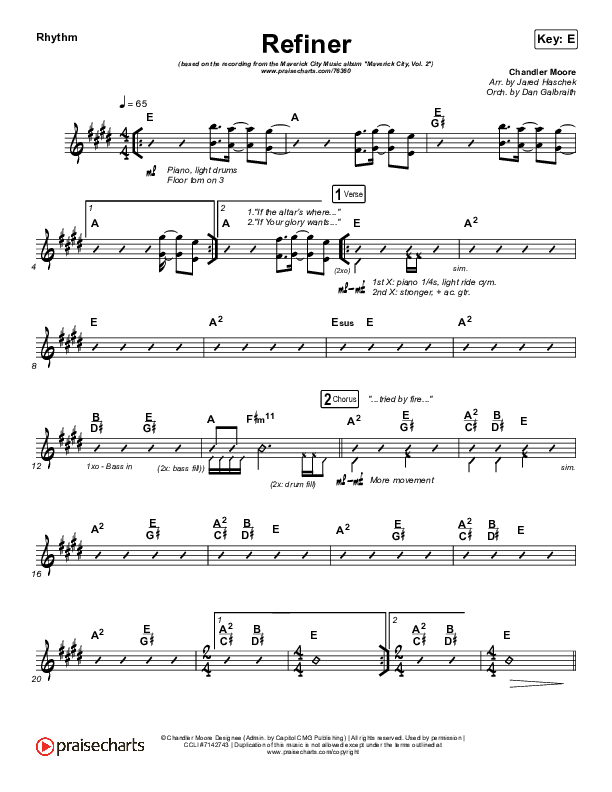 Download the Rhythm Chart for Refiner by Maverick City Music / Steffany Gretzinger, from the album Maverick City Vol. 2. This song was arranged by Jared Haschek / Daniel Galbraith in the key of E, F.