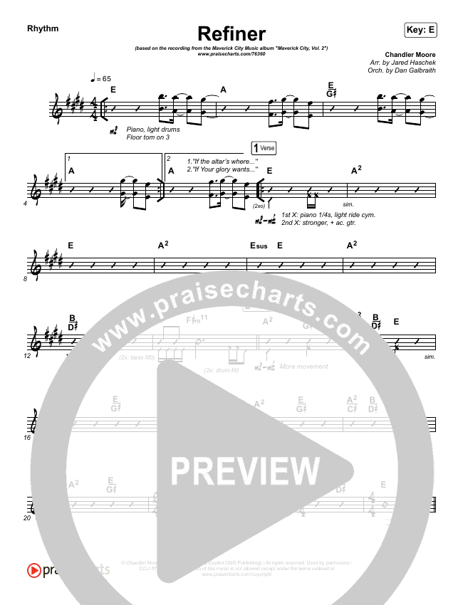 Download the Rhythm Chart for Refiner by Maverick City Music / Steffany Gretzinger, from the album Maverick City Vol. 2. This song was arranged by Jared Haschek / Daniel Galbraith in the key of E, F.