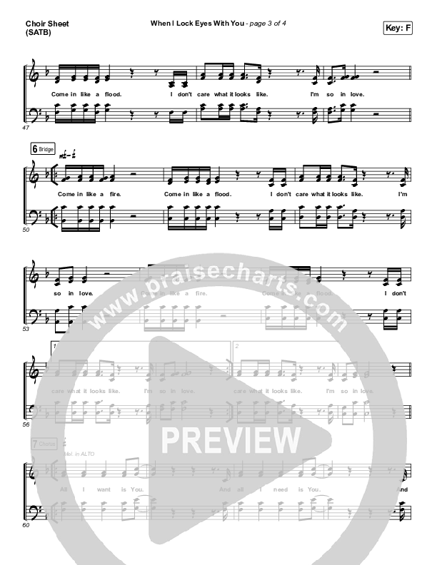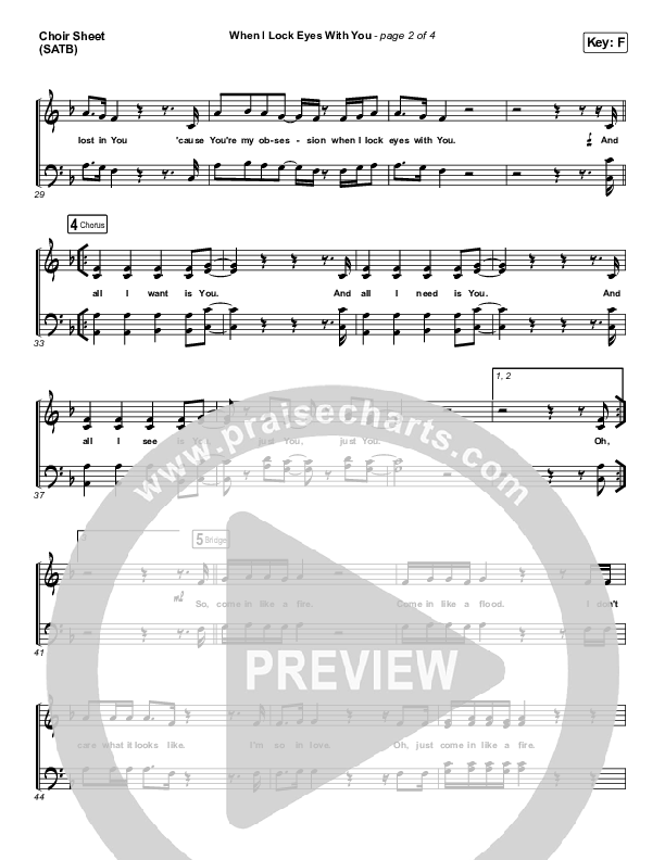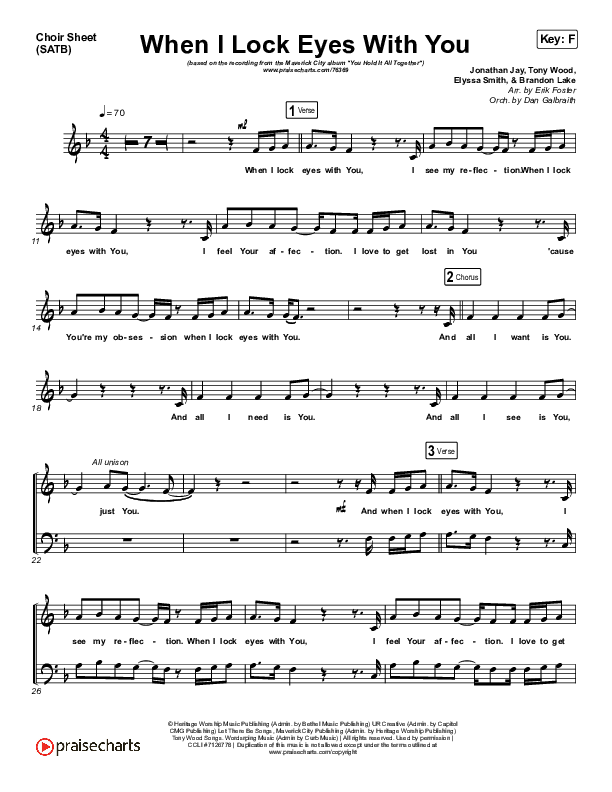 Download the Choir Sheet for When I Lock Eyes With You by Maverick City Music / UPPERROOM / Abbie Gamboa / Naomi Raine / Joel Figueroa, from the album You Hold It All Together. This song was arranged by Erik Foster / Daniel Galbraith in the key of F, G.