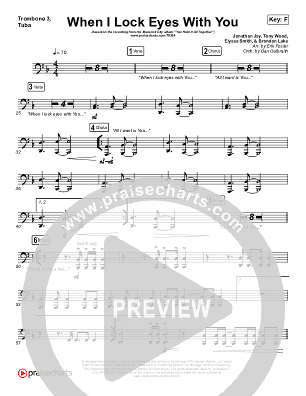 Download the Trombone 3/Tuba sheet music for When I Lock Eyes With You by Maverick City Music / UPPERROOM / Abbie Gamboa / Naomi Raine / Joel Figueroa, from the album You Hold It All Together. This song was arranged by Erik Foster / Daniel Galbraith in the key of F, G.