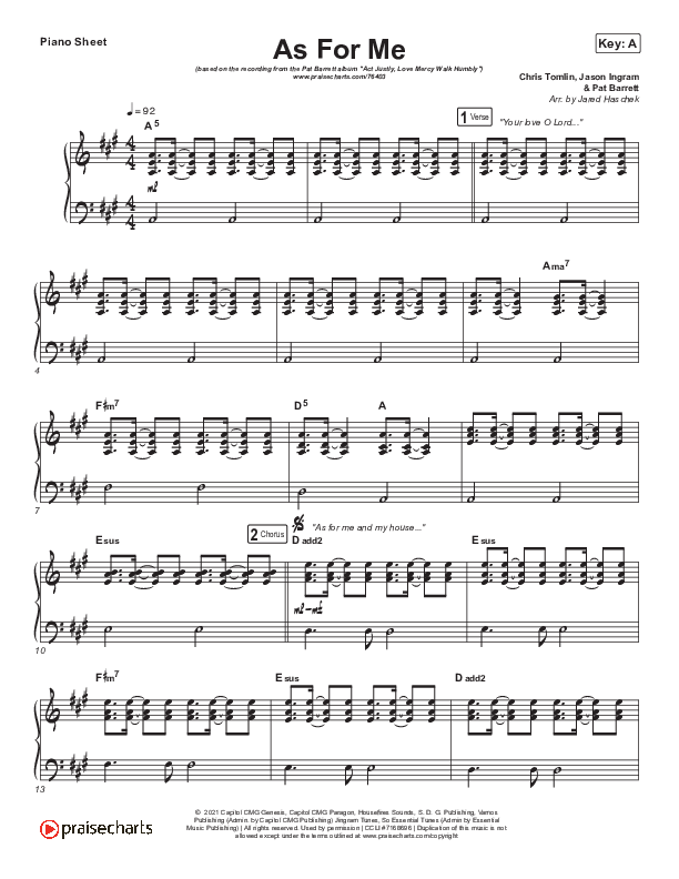 Download the piano sheet for As For Me by Pat Barrett / Chris Tomlin, from the album Act Justly Love Mercy Walk Humbly. This song was arranged by Jared Haschek in the key of A, Ab.