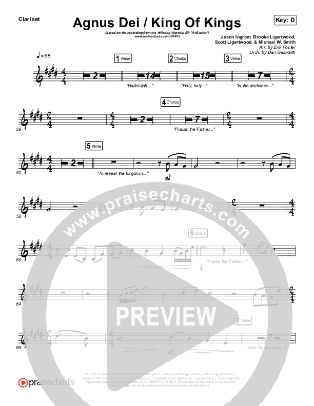 Download the Orchestration for Agnus Dei / King Of Kings by Hillsong Worship / Chidima / Passion / Jenn Johnson / Brooke Ligertwood, from the album At Easter. This song was arranged by Erik Foster / Daniel Galbraith in the key of D, Eb.