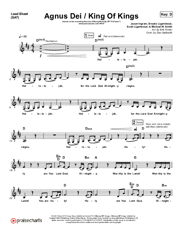 Download the sheet music for Agnus Dei / King Of Kings by Hillsong Worship / Chidima / Passion / Jenn Johnson / Brooke Ligertwood, from the album At Easter. This song was arranged by Erik Foster / Daniel Galbraith in the key of D, Eb.
