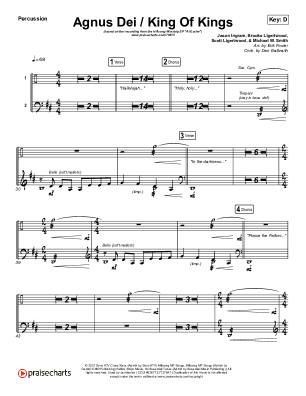 Download the percussion sheet music for Agnus Dei / King Of Kings by Hillsong Worship / Chidima / Passion / Jenn Johnson / Brooke Ligertwood, from the album At Easter. This song was arranged by Erik Foster / Daniel Galbraith in the key of D, Eb.