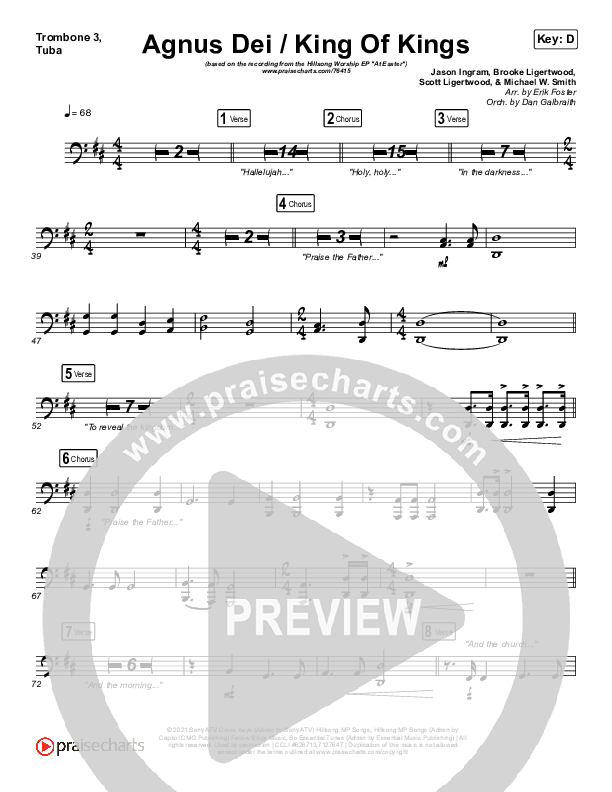 Download the Trombone 3/Tuba sheet music for Agnus Dei / King Of Kings by Hillsong Worship / Chidima / Passion / Jenn Johnson / Brooke Ligertwood, from the album At Easter. This song was arranged by Erik Foster / Daniel Galbraith in the key of D, Eb.