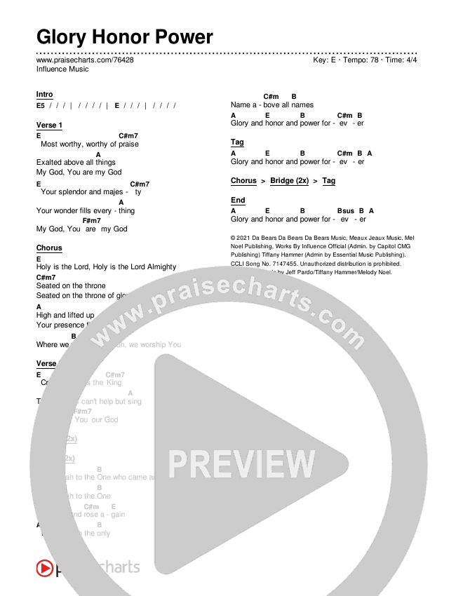 Download the PDF Chord Charts for Glory Honor Power by Influence Music, from the album Ages (Deluxe). This song was arranged by Erik Foster / Daniel Galbraith in the key of E, Eb.