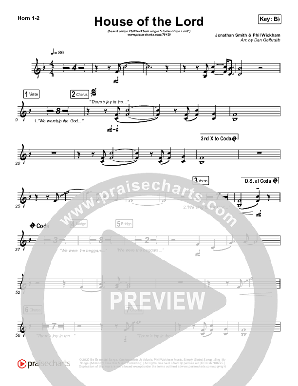 Download the French Horn sheet music for House Of The Lord by Phil Wickham, from the album Hymn Of Heaven. This song was arranged by Daniel Galbraith in the key of A, Bb, G.