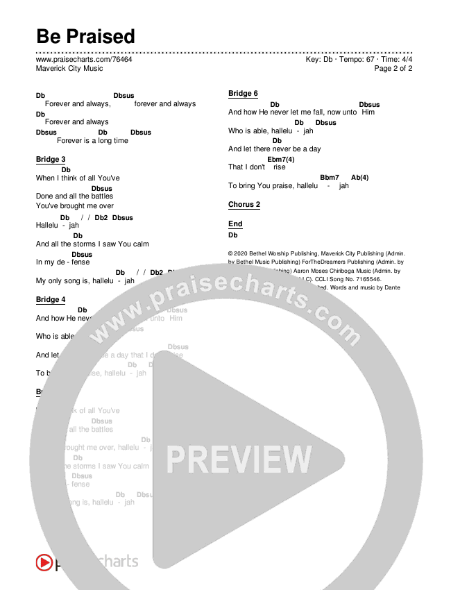 Download the PDF Chord Charts for Be Praised by Maverick City Music, from the album Maverick City Vol 3 Part 2. This song was arranged by Grant Wall in the key of C, Db.