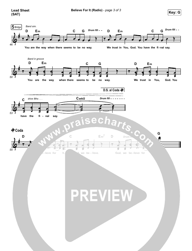 Download the sheet music for Believe For It (Radio) by CeCe Winans, from the album Believe For It (Deluxe). This song was arranged by Daniel Galbraith / Grant Wall in the key of F, G.