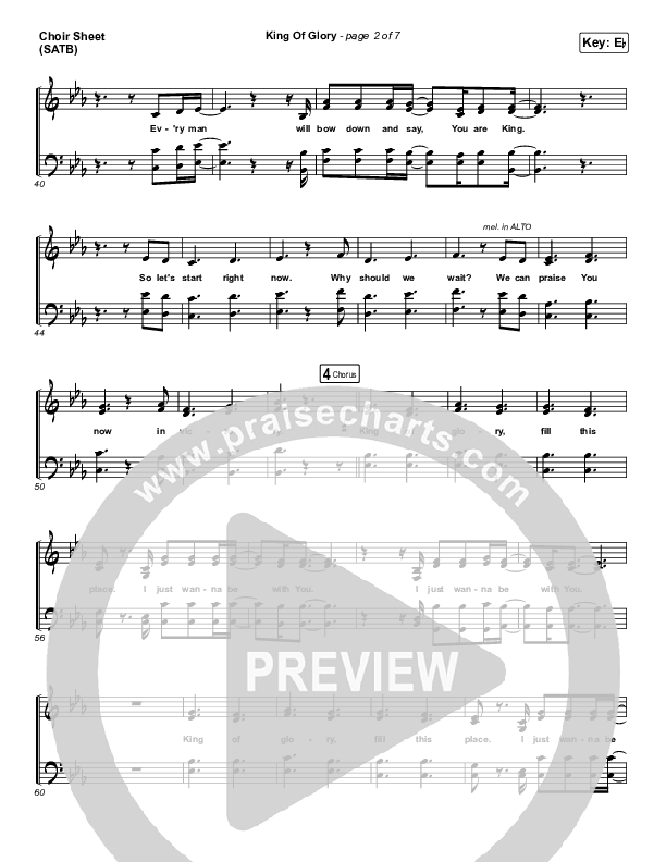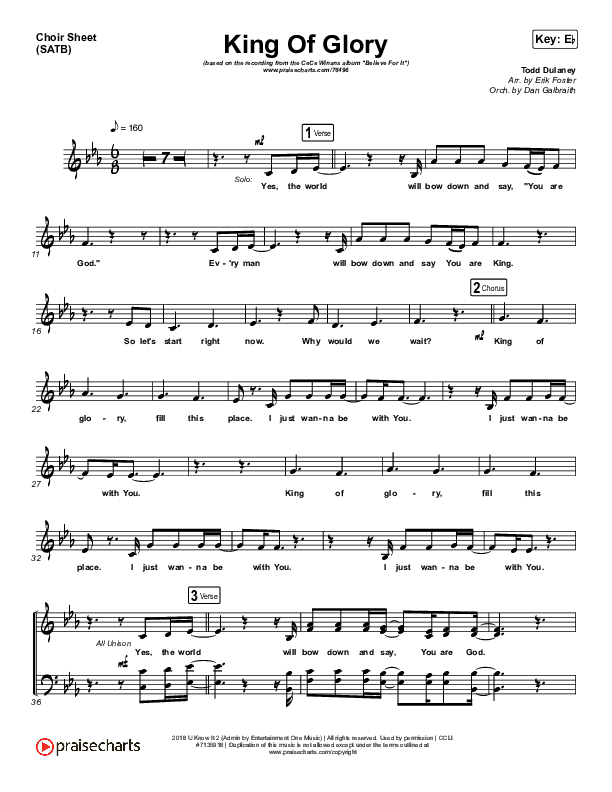 Download the Choir Sheet for King Of Glory (Live) by CeCe Winans, from the album Believe For It (Deluxe). This song was arranged by Erik Foster in the key of D, Eb.