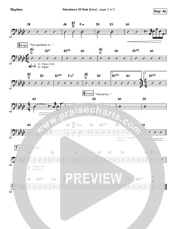 Download the Rhythm Chart for Goodness Of God (Live) by CeCe Winans, from the album Believe For It (Deluxe). This song was arranged by Dustin Loehrs / Daniel Galbraith in the key of A, Ab, G, Gb.