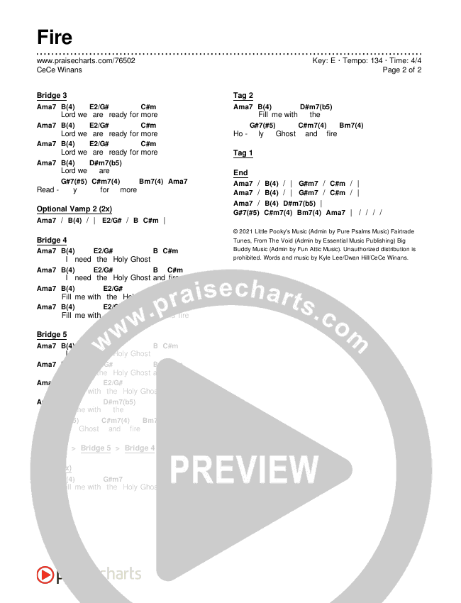 Download the PDF Chord Charts for Fire by CeCe Winans, from the album Believe For It (Deluxe). This song was arranged by Dustin Loehrs / Daniel Galbraith in the key of E, Eb.