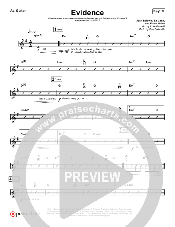 Download the Acoustic Guitar sheet music for Evidence (Choral Anthem SATB) by Josh Baldwin / Arr. Luke Gambill, from the album Evidence. This song was arranged by Luke Gambill / Daniel Galbraith in the key of G.