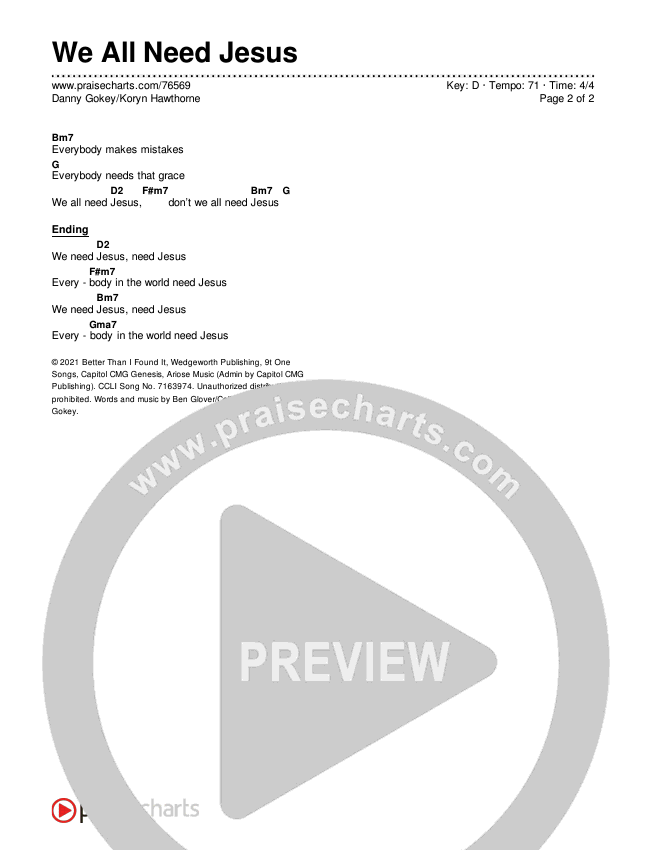 Download the PDF Chord Charts for We All Need Jesus by Danny Gokey / Koryn Hawthorne, from the album Jesus People. This song was arranged by Dustin Loehrs in the key of D, Db.