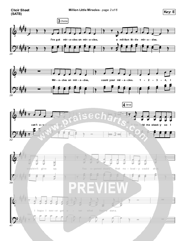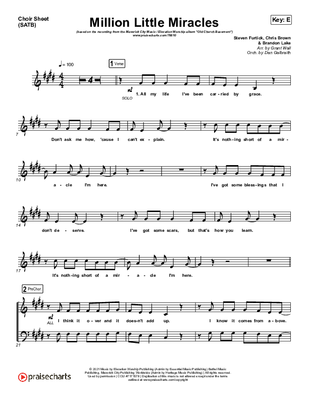 Download the Choir Sheet for Million Little Miracles by Maverick City Music / Elevation Worship, from the album Old Church Basement. This song was arranged by Grant Wall / Daniel Galbraith in the key of E, Eb.