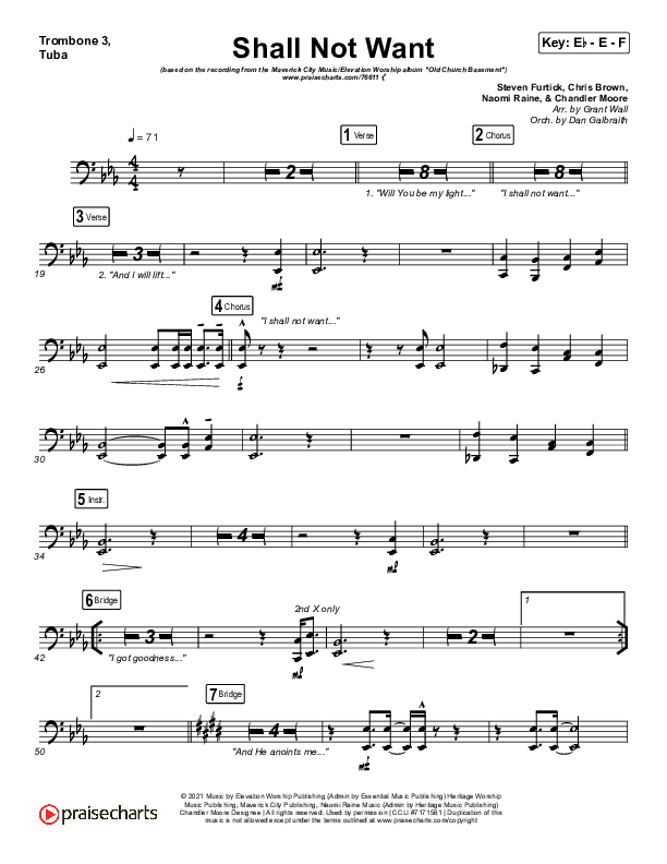 Download the Trombone 3/Tuba sheet music for Shall Not Want by Maverick City Music / Elevation Worship / Chandler Moore, from the album Old Church Basement. This song was arranged by Grant Wall / Daniel Galbraith in the key of D, Eb.