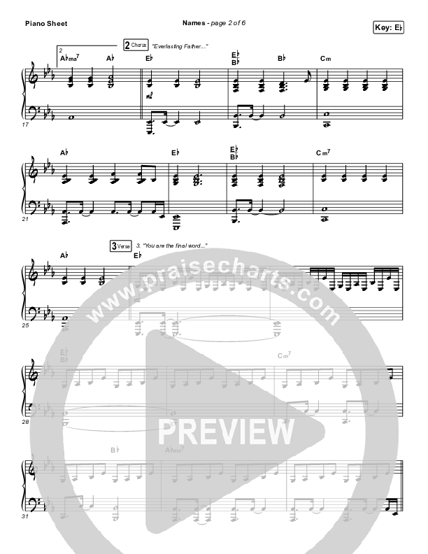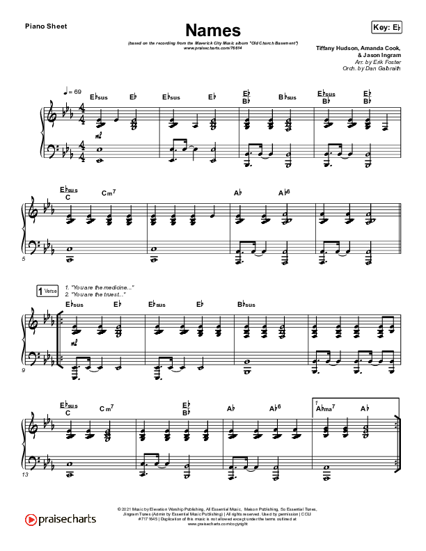 Download the piano sheet for Names by Maverick City Music / Elevation Worship / Tiffany Hudson, from the album Old Church Basement. This song was arranged by Erik Foster / Daniel Galbraith in the key of E, Eb.