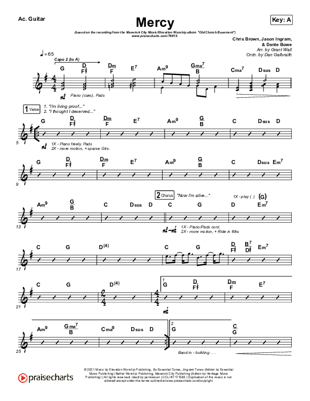 Download the Acoustic Guitar sheet music for Mercy by Maverick City Music / Elevation Worship / Chris Brown, from the album Old Church Basement. This song was arranged by Grant Wall / Daniel Galbraith in the key of A, Ab.
