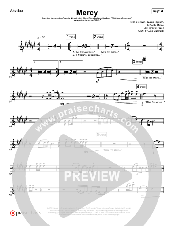 Download the AltoSax sheet music for Mercy by Maverick City Music / Elevation Worship / Chris Brown, from the album Old Church Basement. This song was arranged by Grant Wall / Daniel Galbraith in the key of A, Ab.