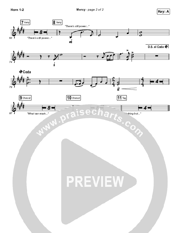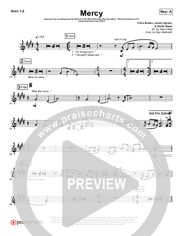 Download the French Horn sheet music for Mercy by Maverick City Music / Elevation Worship / Chris Brown, from the album Old Church Basement. This song was arranged by Grant Wall / Daniel Galbraith in the key of A, Ab.
