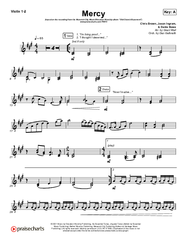 Download the Violin sheet music for Mercy by Maverick City Music / Elevation Worship / Chris Brown, from the album Old Church Basement. This song was arranged by Grant Wall / Daniel Galbraith in the key of A, Ab.