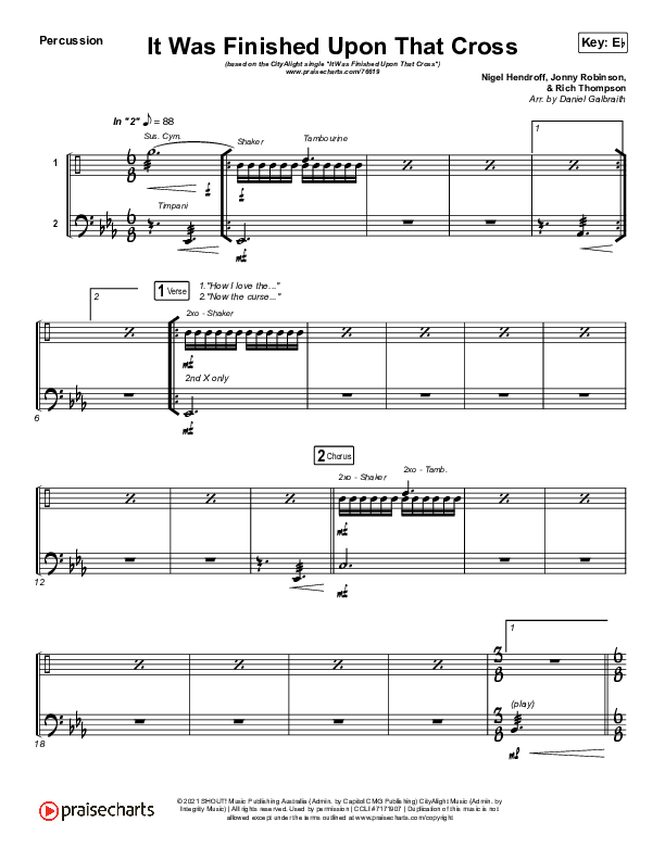 Download the percussion sheet music for It Was Finished Upon That Cross by CityAlight, from the album It Was Finished Upon That Cross - Single. This song was arranged by Daniel Galbraith in the key of D, E, Eb, F.