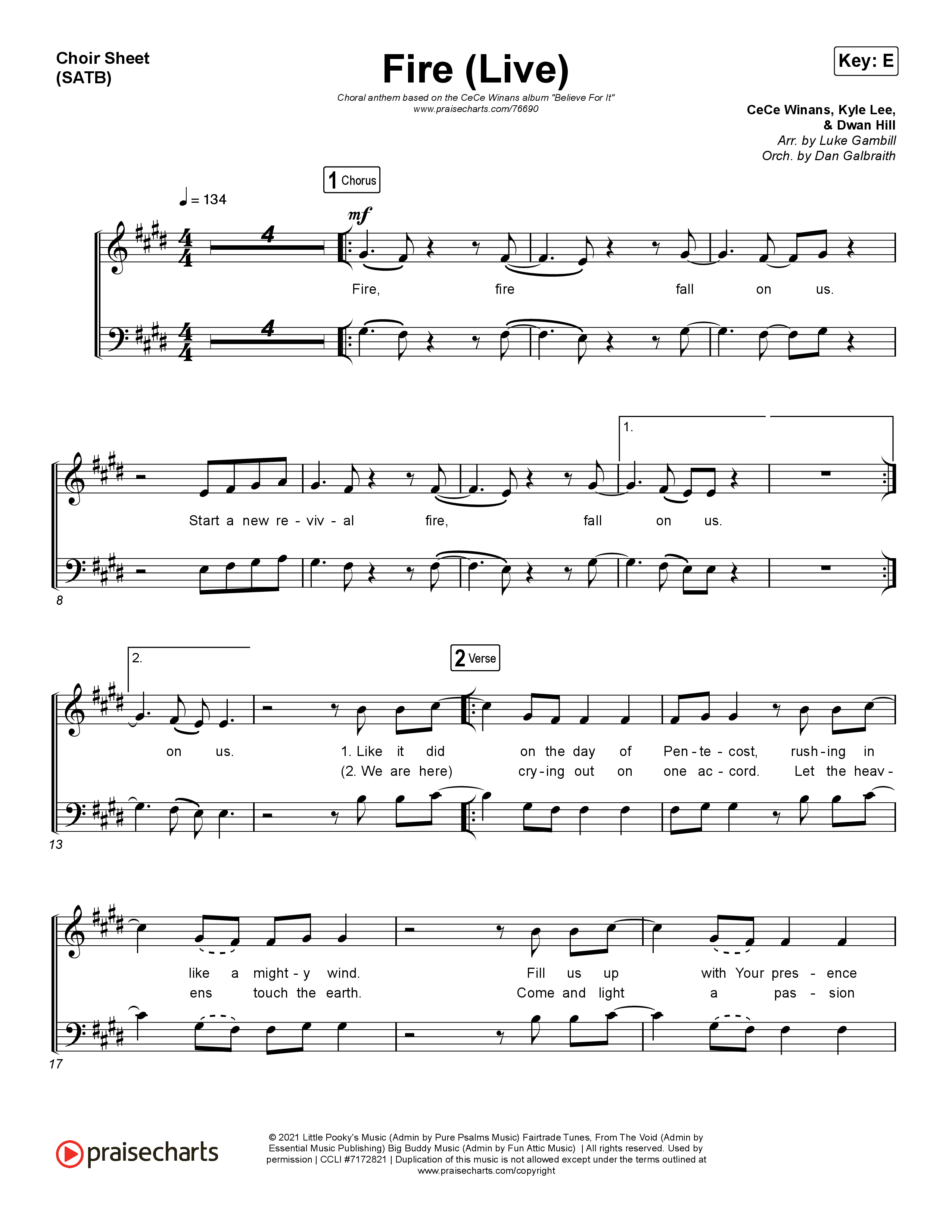 Download the Choir Sheet for Fire (Choral Anthem SATB) by CeCe Winans / Arr. Luke Gambill, from the album Believe For It (Deluxe). This song was arranged by Luke Gambill / Daniel Galbraith in the key of E.