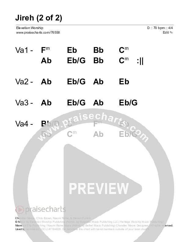Download the free PDF Chord Charts for Jireh (Choral Anthem SATB) by Elevation Worship / Maverick City Music / Chandler Moore / Naomi Raine / Arr. Cliff Duren / Mason Brown, from the album Jireh. This song was arranged by Mason Brown / Cliff Duren in the key of Eb.