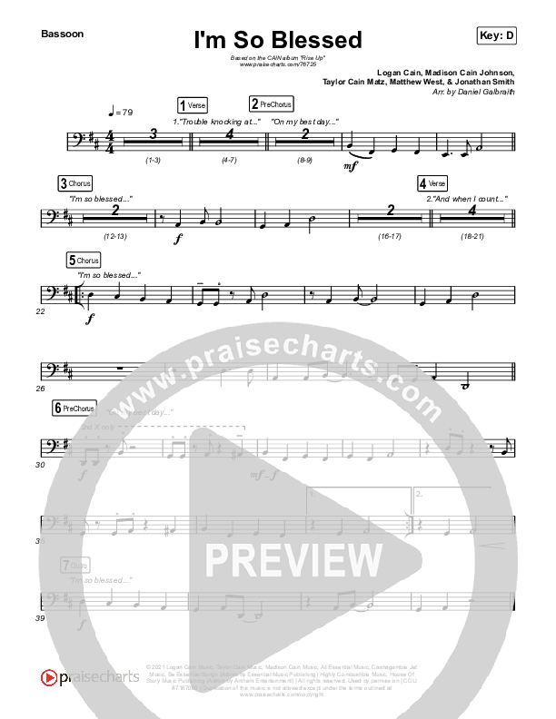 Download the Bassoon sheet music for I'm So Blessed by CAIN, from the album Rise Up. This song was arranged by Daniel Galbraith in the key of Bb, C, D.