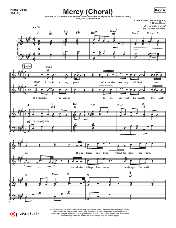 Download the sheet music for Mercy (Choral Anthem SATB) by Maverick City Music / Elevation Worship / Chris Brown / Arr. Luke Gambill, from the album Old Church Basement. This song was arranged by Luke Gambill / Daniel Galbraith in the key of A.