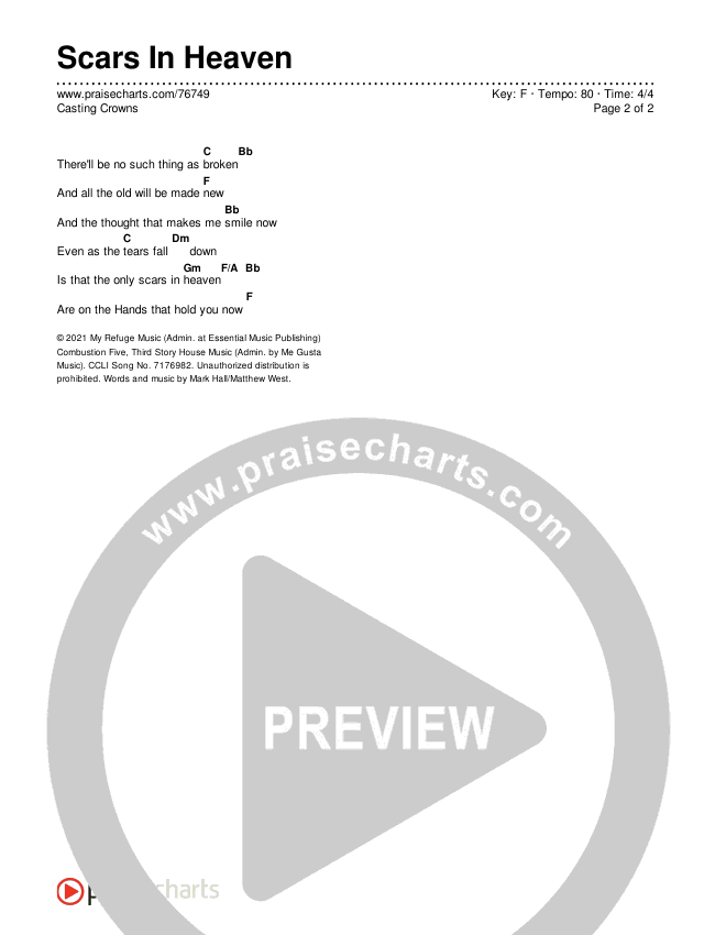 Download the PDF Chord Charts for Scars In Heaven by Casting Crowns, from the album Healer. This song was arranged by Daniel Galbraith in the key of E, F.