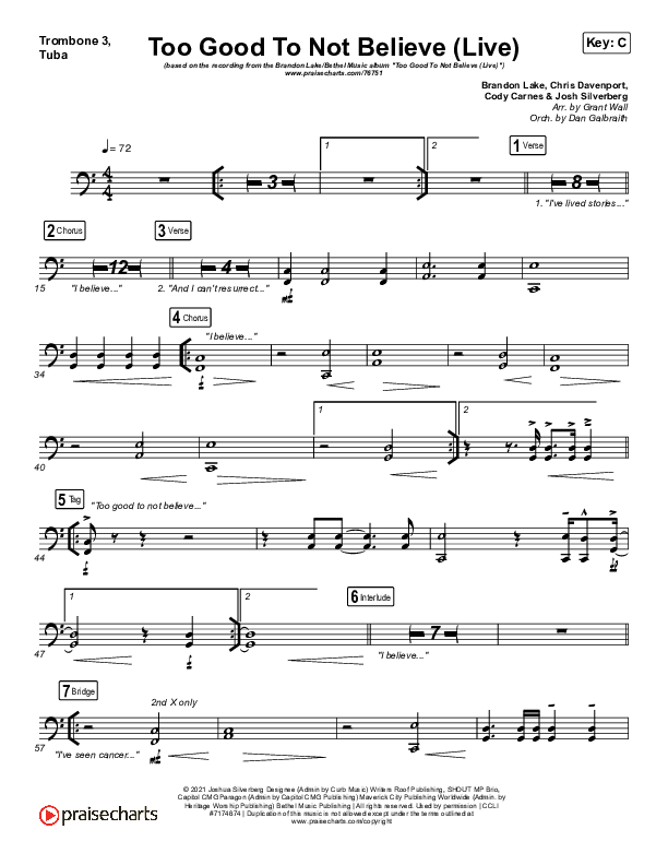 Download the Trombone 3/Tuba sheet music for Too Good To Not Believe (Live) by Bethel Music / Brandon Lake, from the album Homecoming. This song was arranged by Grant Wall / Daniel Galbraith in the key of Bb, C.