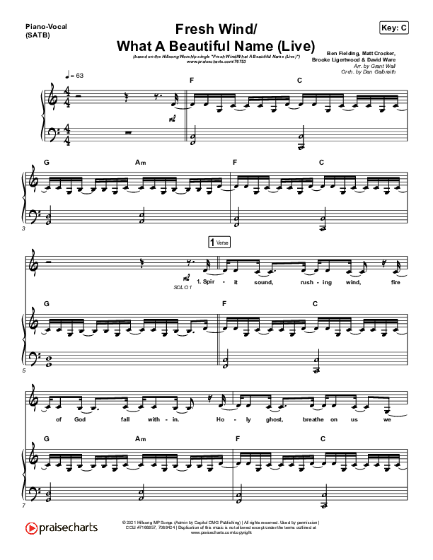 Download the sheet music for Fresh Wind / What A Beautiful Name (Live) by Hillsong Worship, from the album Fresh Wind / What A Beautiful Name. This song was arranged by Grant Wall in the key of C, D.