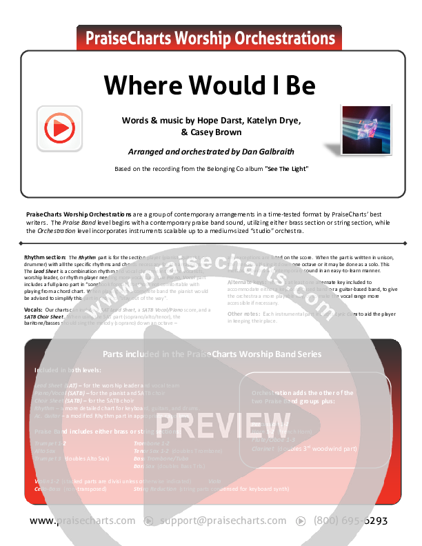 Download the Orchestration for Where Would I Be (Live) by The Belonging Co / Hope Darst, from the album See The Light. This song was arranged by Daniel Galbraith in the key of E, Eb.
