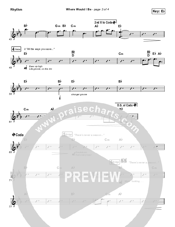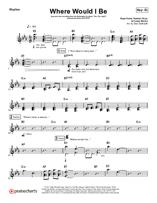 Download the Rhythm Chart for Where Would I Be (Live) by The Belonging Co / Hope Darst, from the album See The Light. This song was arranged by Daniel Galbraith in the key of E, Eb.