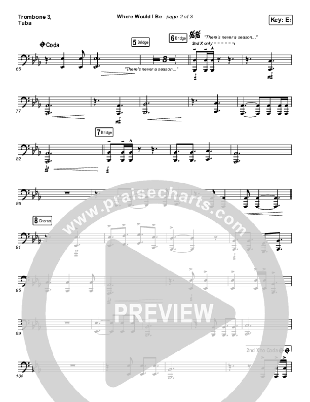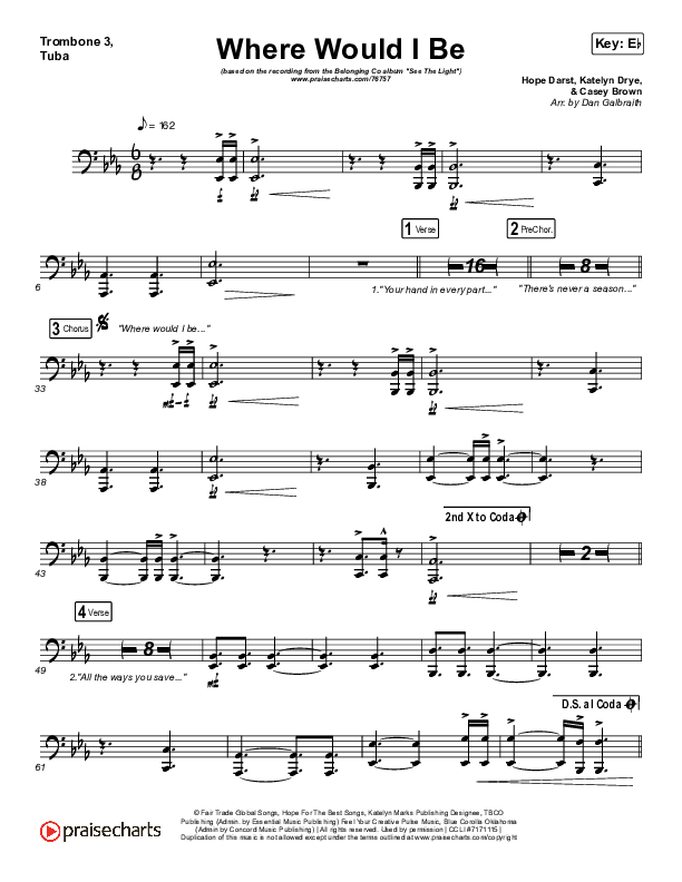 Download the Trombone 3/Tuba sheet music for Where Would I Be (Live) by The Belonging Co / Hope Darst, from the album See The Light. This song was arranged by Daniel Galbraith in the key of E, Eb.