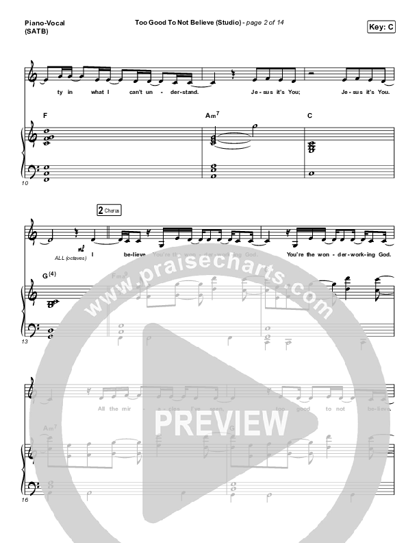 Download the sheet music for Too Good To Not Believe (Studio) by Cody Carnes / Brandon Lake, from the album Too Good To Not Believe. This song was arranged by Daniel Galbraith in the key of Bb, C.