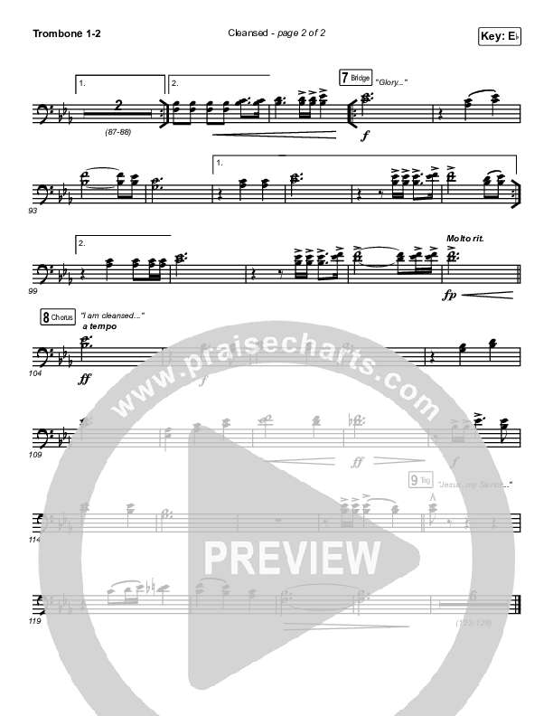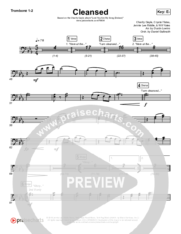 Download the Trombone 1,2 sheet music for Cleansed by Charity Gayle, from the album Lord You Are My Song (Deluxe). This song was arranged by Dustin Loehrs / Daniel Galbraith in the key of D, Eb.