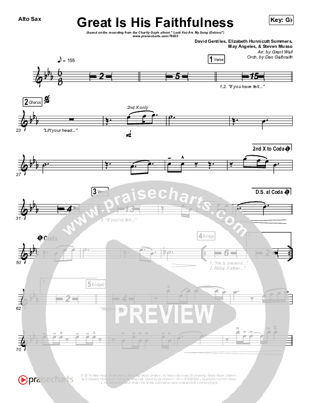Download the AltoSax sheet music for Great Is His Faithfulness by Charity Gayle, from the album Lord You Are My Song (Deluxe). This song was arranged by Grant Wall / Daniel Galbraith in the key of G, Gb.