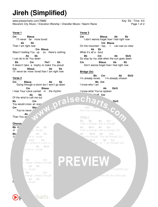 Download the PDF Chord Charts for Jireh (Simplified) by Maverick City Music / Elevation Worship / Chandler Moore / Naomi Raine, from the album Simplified Worship.