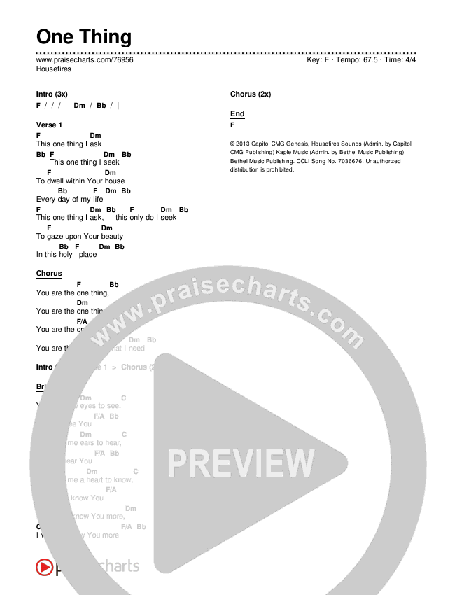 Verse 1 This one thing I ask, this one thing I seek To dwell within Your house every day of my life This one thing I ask, this only do I seek To gaze upon Your beauty in this holy place Chorus You are the one thing, You are the one thing that I need You are the one thing, You are the one thing that I need Bridge You give me eyes to see, eyes to see You You give me ears to hear, ears to hear You You give me a heart to know, a heart to know You I want to know You more, I want to know You more...