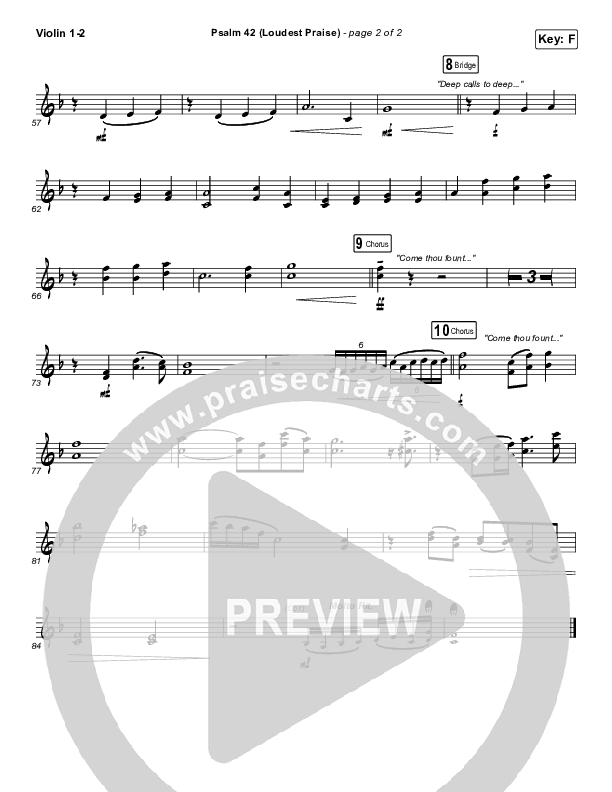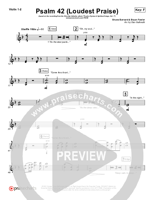 Download the Violin sheet music for Psalm 42 (Loudest Praise) by The Worship Initiative / Shane & Shane, from the album Psalms Hymns And Spiritual Songs Vol 1. This song was arranged by Daniel Galbraith in the key of E, F.