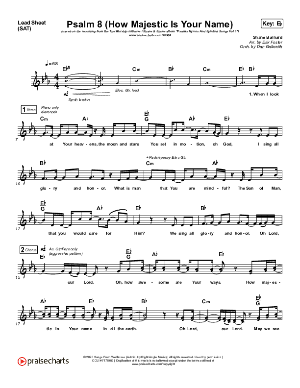 Download the sheet music for Psalm 8 (How Majestic Is Your Name) by The Worship Initiative / Shane & Shane, from the album Psalms Hymns And Spiritual Songs Vol 1. This song was arranged by Erik Foster / Daniel Galbraith in the key of E, Eb.