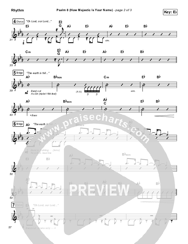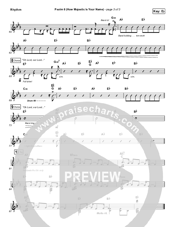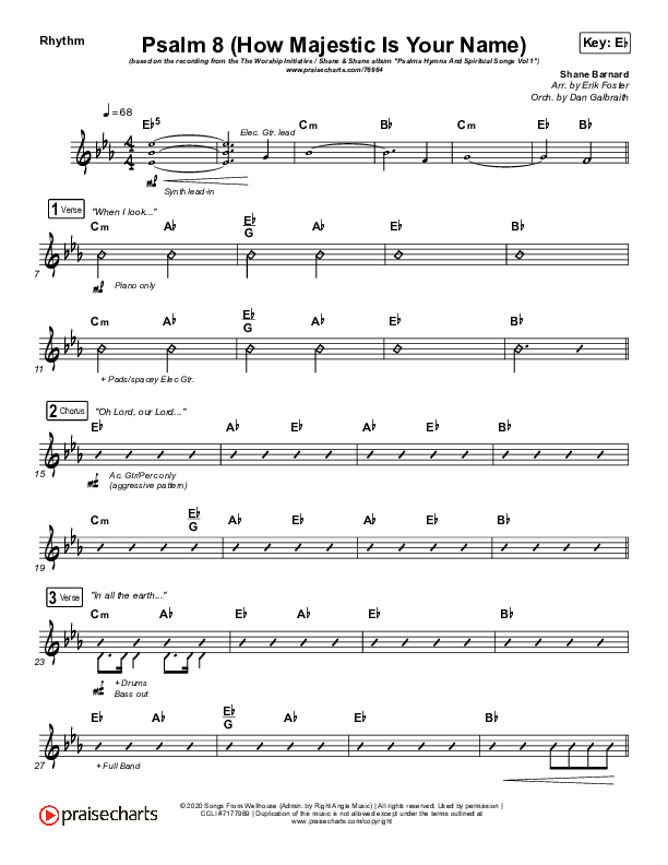 Download the Rhythm Chart for Psalm 8 (How Majestic Is Your Name) by The Worship Initiative / Shane & Shane, from the album Psalms Hymns And Spiritual Songs Vol 1. This song was arranged by Erik Foster / Daniel Galbraith in the key of E, Eb.