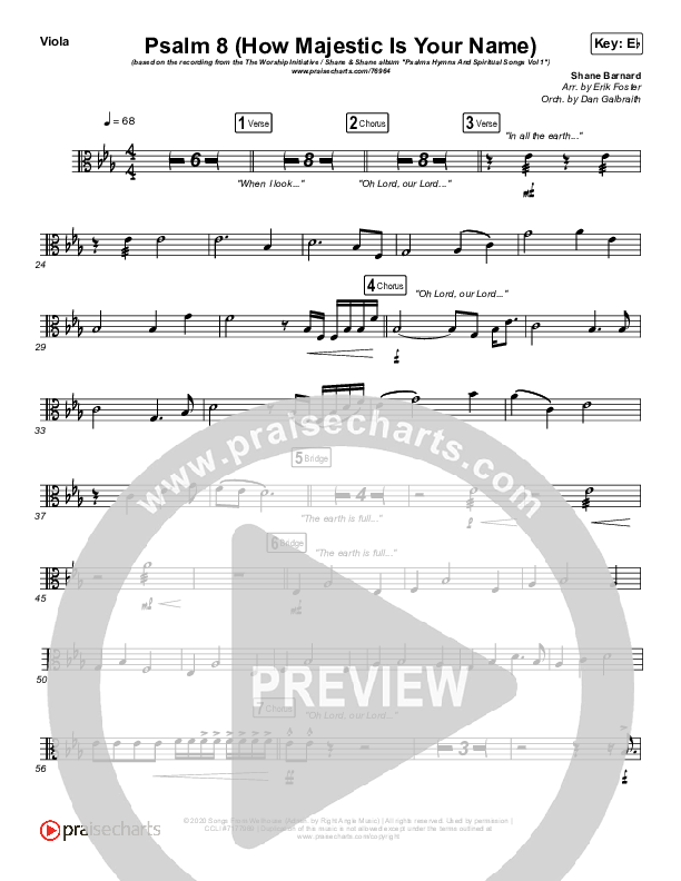 Download the Viola sheet music for Psalm 8 (How Majestic Is Your Name) by The Worship Initiative / Shane & Shane, from the album Psalms Hymns And Spiritual Songs Vol 1. This song was arranged by Erik Foster / Daniel Galbraith in the key of E, Eb.