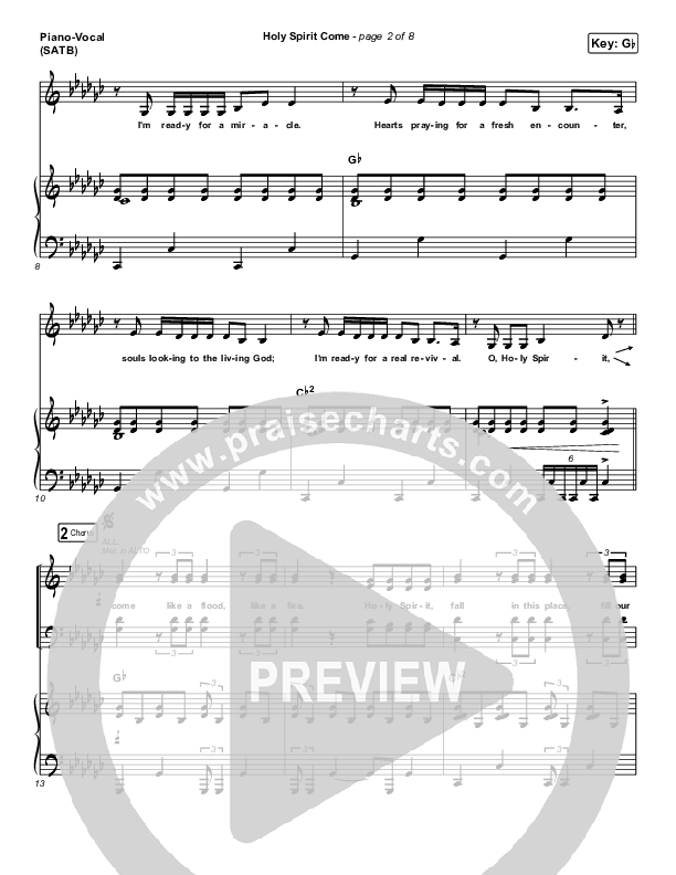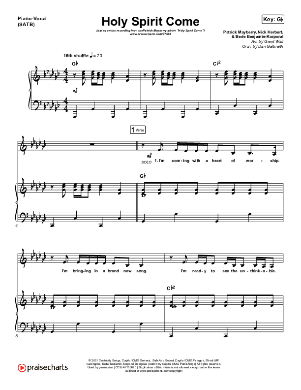 Download the sheet music for Holy Spirit Come by Patrick Mayberry, from the album Holy Spirit Come. This song was arranged by Grant Wall / Daniel Galbraith in the key of G, Gb.