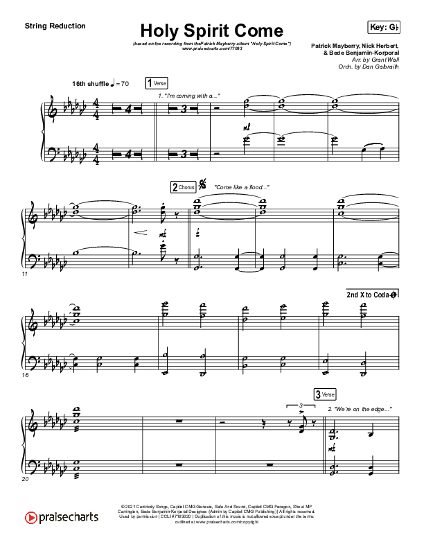 Download the Orchestration for Holy Spirit Come by Patrick Mayberry, from the album Holy Spirit Come. This song was arranged by Grant Wall / Daniel Galbraith in the key of G, Gb.