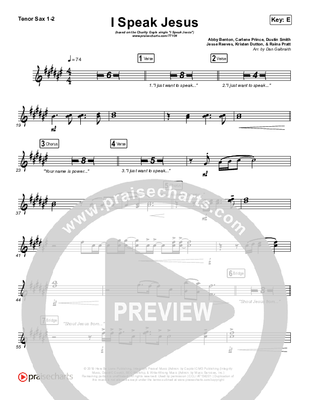 Download the Saxaphone instruments PDF sheet music for I Speak Jesus by Charity Gayle, from the album I Speak Jesus. This song was arranged by Daniel Galbraith in the key of E, F.