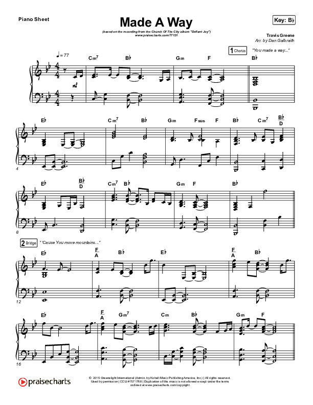 Download the piano sheet for Made A Way by Church Of The City, from the album Defiant Joy. This song was arranged by Daniel Galbraith in the key of A, Bb.